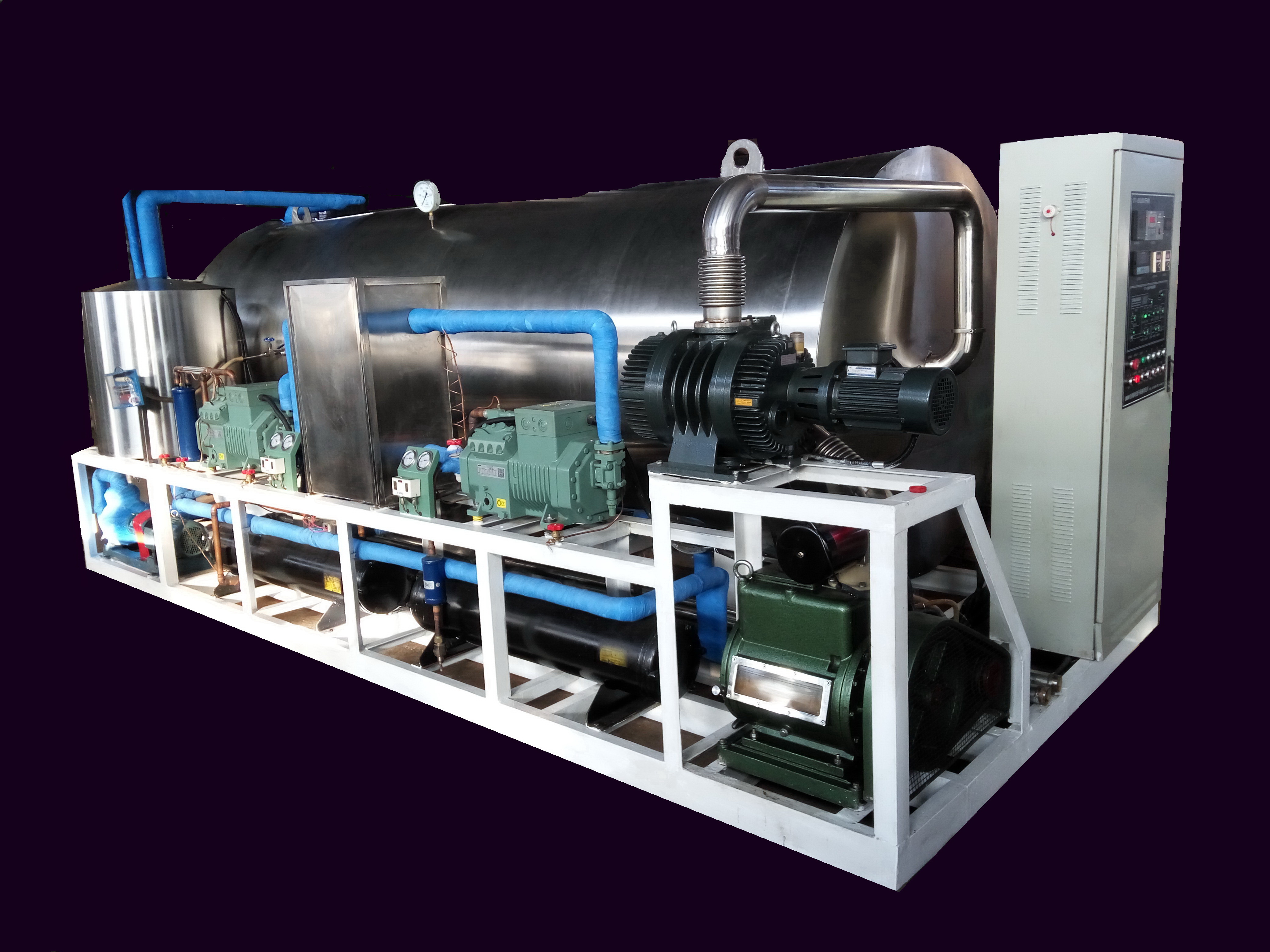 DT系列真空冷凍干燥機是利用升華原理將物料中的水預(yù)先凍結(jié)成冰以后在真空環(huán)境下脫除的一款干燥設(shè)備,區(qū)別于普通干燥設(shè)備的是經(jīng)該機脫水后的物料外形色澤和成分均可以保持原狀,組織多孔酥松,尤其粉體物料凍干后微觀松散而不結(jié)團,極易溶于水。因此該機被廣泛應(yīng)用于生物制品、中西藥品、藥用原料、各類濃縮液制粉、各類食品、超細微粉、催化劑、石墨烯等材料制備等各個行業(yè)。我國真空冷凍干燥機從20年前依賴進口到現(xiàn)在完全國產(chǎn)化,走過了漫長的發(fā)展歷程。本公司經(jīng)近20年的不斷努力創(chuàng)新,所生產(chǎn)的DT系列凍干設(shè)備從最原始簡陋的機型到現(xiàn)在集多項先進技術(shù)于一身的現(xiàn)代機型,已經(jīng)有了質(zhì)的飛躍,主要經(jīng)濟技術(shù)指標(biāo)(包括干制品品質(zhì)、運行穩(wěn)定性、使用壽命、節(jié)能降耗等)均已達到世界先進水平。